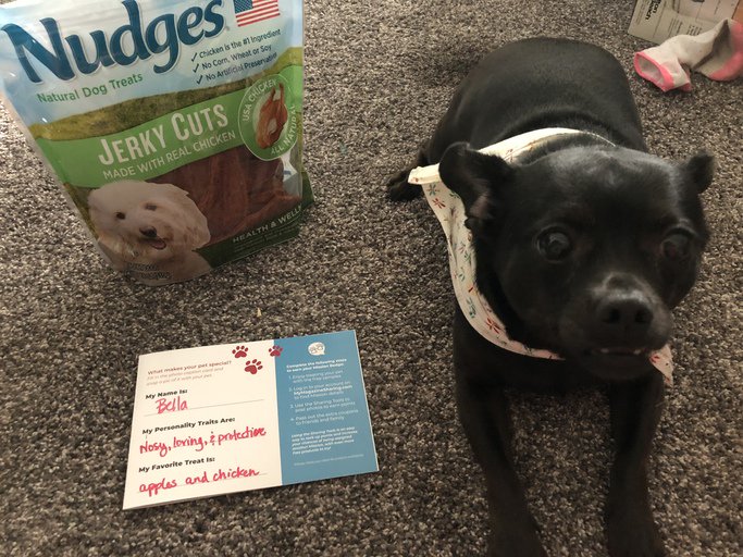 If this picture showed Bella's belly, you would see that she not only loves us but also loves food. And what you also can't tell in this picture is that I'm holding one of the Nudges in my hand to encourage Bella to cooperate and smile pretty for the camera. She nearly died waiting for me to take the picture, but soldiered on and was rewarded with some yummy chicken jerky. She also loved the Purina One True Instinct Trios treats, Pup-peroni, and nearly lost her mind over the Nature's Recipe Wet Dog Food (a true treat for a dog used to dry kibble). There was a sample of Blue Buffalo Dog Food, but this wasn't one of Bella's favorites. I guess my fur-child's palate isn't sophisticated enough for that, but she was otherwise happy to try out all these goodies.